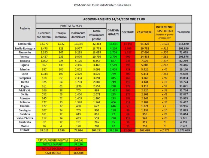 I dati della Protezione civile per l’emergenza covid-19, aggiornati al 14 aprile, parlano di 162.488 persone che hanno contratto il virus.