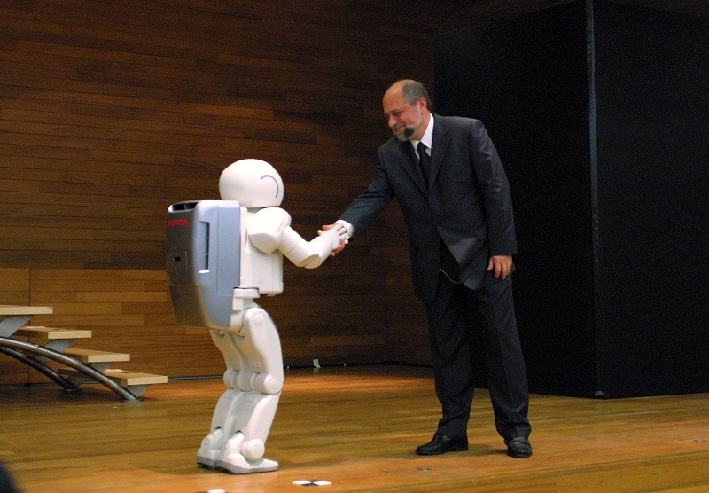PRESENTAZIONE DEL ROBOT ASIMO DELLA HONDA DURANTE IL CONVEGNO GIAPPONE OGGI ECONOMIA E INNOVAZIONE TECNOLOGICA ALL'UNIVERSITA' BOCCONI NELLA FOTO CON UN RESPONSABILE DEL LABORATORIO DI RICERCA INTELLIGENZA ARTIFICIALE HONDA (MILANO - 2005-05-05, Alberto Cattaneo) p.s. la foto e' utilizzabile nel rispetto del contesto in cui e' stata scattata, e senza intento diffamatorio del decoro delle persone rappresentate