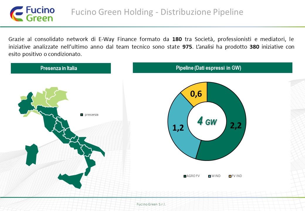 Fucino Green – società del Gruppo dedicata al settore dell’ambiente, ecologia ed economia circolare – è stata costituita nel 2021 ed è partecipata anche da Volt ESG srl di Giuseppe Ciardi, imprenditore italiano con un importante background nella finanza internazionale e già impegnato nella realizzazione di progetti fotovoltaici e di storage nel Regno Unito. Volt ESG ha dato un notevole contributo alla realizzazione dell’operazione”. Fucino Green è guidata dal Presidente Gabriele Gravina e dall’Amministratore Delegato Alessandro Schiavone e oggi detiene, oltre al controllo della piattaforma E-Way Finance, anche un portafoglio di progetti fotovoltaici in proprio di circa 70 MW, dei quali circa 15 in fase di costruzione.
