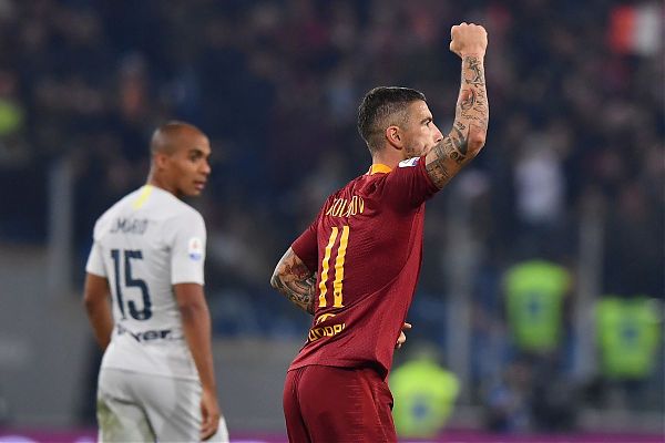 Allo Stadio Olimpico la migliore realizzatrice in incontri casalinghi (13) in questo campionato ospita la seconda migliore difesa (10) in Serie A. Lo spettacolo è assicurato e in campo si registrano subito ritmi alti con l’Inter che prova a prendere il pallino del gioco senza disdegnare la soluzione dalla distanza: al 10’ è Keita a provarci dai venticinque metri ma Olsen blocca in due tempi. Un intervento a cui pochi minuti dopo è chiamato anche Handanovic costretto a distendersi per respingere il tiro di Florenzi. Al 25’ c’è la prima occasione da gol del match ed è di marca giallorossa: Schick con un colpo di tacco libera al tiro Florenzi che colpisce il palo dal dischetto del rigore. L’Inter reagisce immediatamente con Borja Valero che premia il taglio di Icardi murato dall’uscita tempestiva di Olsen. Al 34’ la Roma recrimina: Zaniolo viene steso da D’Ambrosio in area ma Rocchi non concede il rigore. Penalty negato e beffa per i giallorossi subito dopo: D’Ambrosio crossa per Keita che appoggia in rete per l’1-0.