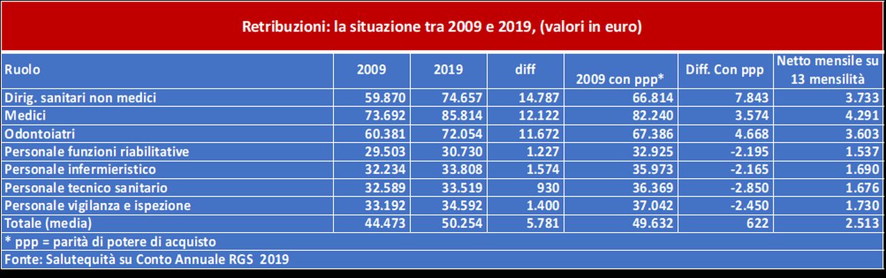 Fin qui le somme calcolate in modo secco. Ma applicando gli indici di parità di potere di acquisto al valore del 2009 e sottraendo l’importo ottenuto da quello complessivo 2019 come indicato dal Conto annuale della Ragioneria generale dello Stato, si vede che in realtà la differenza 2019-2009 resta positiva per la dirigenza sanitaria e va in rosso per il comparto (il personale non dirigente) con un massimo di circa -2.850 euro per il personale del ruolo tecnico sanitario e un minimo, sempre in media, di -2.165 circa per il personale infermieristico.