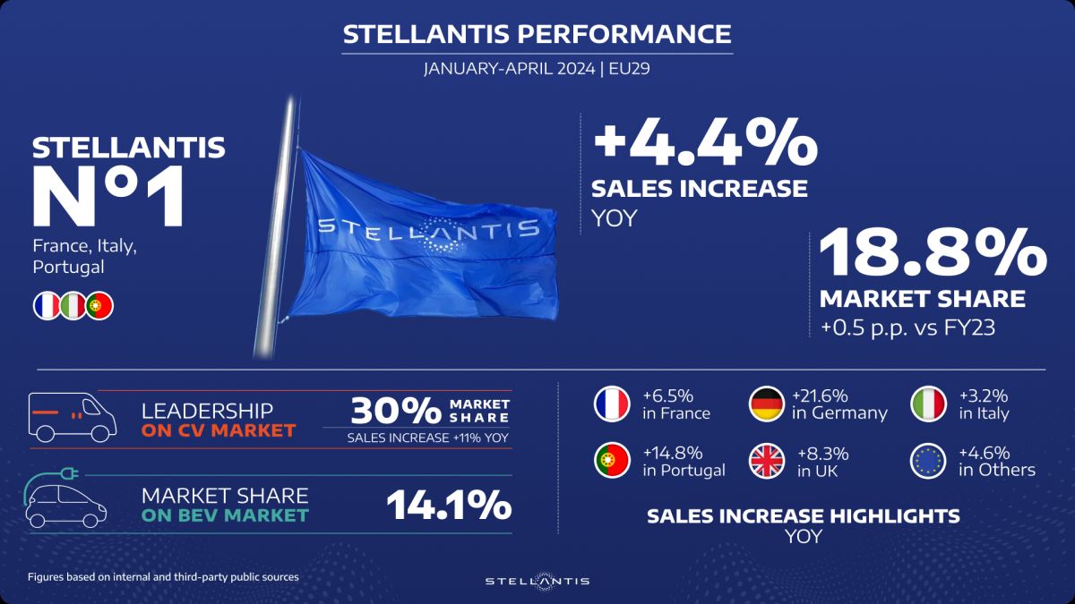 AMSTERDAM (OLANDA) (ITALPRESS) – In un mercato sempre più impegnativo, Stellantis rimane risoluta nel suo impegno per le prestazioni e la soddisfazione dei clienti. Nel perimetro EU29, Stellantis registra un aumento del 4,4% dei volumi autovetture e veicoli commerciali (PC+CV) su base annua nei primi quattro mesi del 2024, assicurandosi una quota di mercato del 18,8%, in aumento di 0,5 punti rispetto ai risultati dell’esercizio 2023.