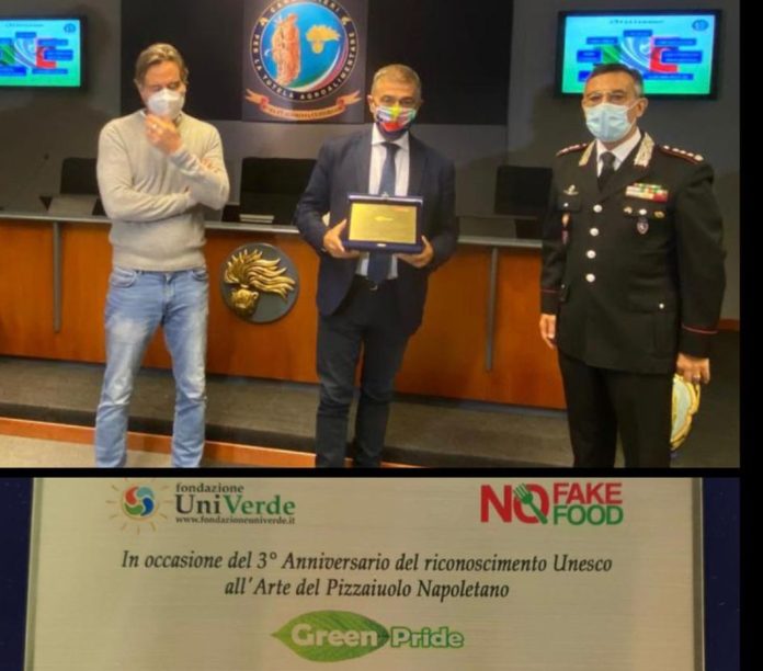 ROMA (ITALPRESS) – Alfonso Pecoraro Scanio presidente della fondazione Univerde e promotore della campagna #NoFakefood il e Jimmy Ghione testimonial della campagna hanno consegnato il riconoscimento Green Pride per la lotta all’agropirateria al comando Carabinieri tutela agroalimentare consegnandolo al comandante Luigi Cortellessa.