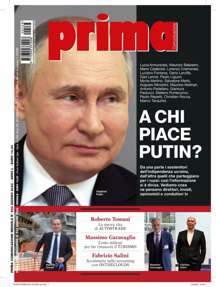 Domina la copertina di Prima Cmunicazione di giugno, la faccia di Putin che guarda ironico verso l’elenco di giornalisti che hanno partecipato a un giro di opinioni sul rapporto dell’informazione italiana con la Russia. I pareri molto diversi degli opinion maker intervistati aiutano a capire le differenze che contraddistinguono l’informazione nostrana. E anche la bravura dei russi nel gestire la comunicazione e la disinformazione. Ma c’è un mondo “normale” che continua a lavorare malgrado le difficolta. E su questo numero di Prima ci sono storie che lo testimoniano. Fabrizio Salini, ex ad della Rai, racconta in esclusiva a Prima, il suo debutto come imprenditore con la neonata società Ontheclouds, un aggregatore di tanti contenuti e di formati che punta soprattutto ad alimentare le piattaforme streaming. Il mondo dei contenuti digitali ha una “super” protagonista: Francesca Cavallo che, partendo da una start app concepita a Montain View, ‘Storie della buonanotte per bambini ribelli’, diventata un successo planetario in digitale e su carta stampata, ha deciso di separarsi da Rebel Girls e di tornare in Italia con il nuovo progetto Undercats Inc. sempre dedicato a nuove storie per i nuovi bambini.