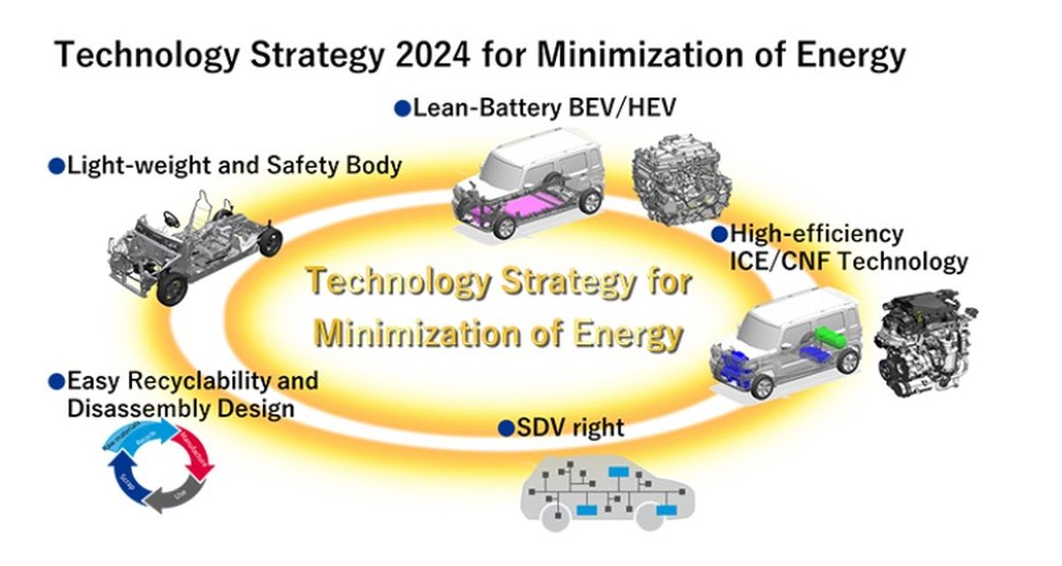 Nel 2023, Suzuki ha sviluppato un motore ad alta efficienza (il Motore Z12E) che ha come obiettivo il miglioramento della combustione, che è il fulcro dei motori a combustione interna, raggiungendo un’efficienza termica massima del 40%. In futuro, questo motore ad alta efficienza sarà esteso a livello globale e Suzuki cercherà di minimizzare il consumo di energia tramite carburanti a zero emissioni e ibridi di nuova generazione. Nell’ambito del Software Defined Vehicle (SDV), Suzuki svilupperà e fornirà ai clienti “SDV right”, un sistema conveniente che crea valore per i veicoli integrando la riduzione dell’energia con l’approccio “Sho-Sho-Kei-Tan-Bi” (compatto, meno numeroso, leggero, minimale, bello).