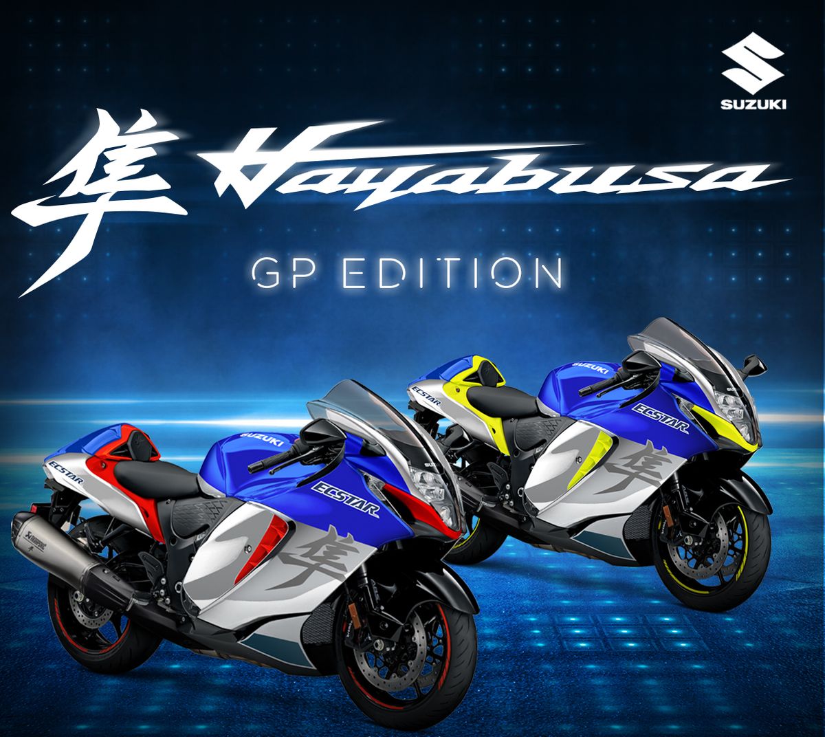Utilizza come colori dominanti il blu e l’argento ardesia, che furono portati in gara dalle prime Suzuki da Gran Premio degli Anni 60 e che dal 2020 caratterizzano anche le GSX-RR ufficiali del Team Ecstar. Queste ultime hanno inserti di colore diverso, per consentire agli spettatori e agli addetti ai lavori di identificare anche da lontano Mir e Rins in corsa. Allo stesso modo, anche la GP Edition permette all’acquirente della Hayabusa di scegliere tra due varianti, Giallo Pista e Rosso Pista. Le tinte sono utilizzate per la cornice inferiore del faro, per le griglie sui fianchi della carenatura, per la porzione del codone che circonda la sella e per gli adesivi apposti sulle ruote. Tutto è realizzato secondo i migliori standard qualitativi, come prassi Suzuki. Vero e proprio fiore all’occhiello di questa GP Edition è un doppio terminale di scarico omologato Akrapovic (slip-on) in titanio, capace di appagare sia la vista che l’udito, con una straordinaria cura dei dettagli e un sound esaltante.