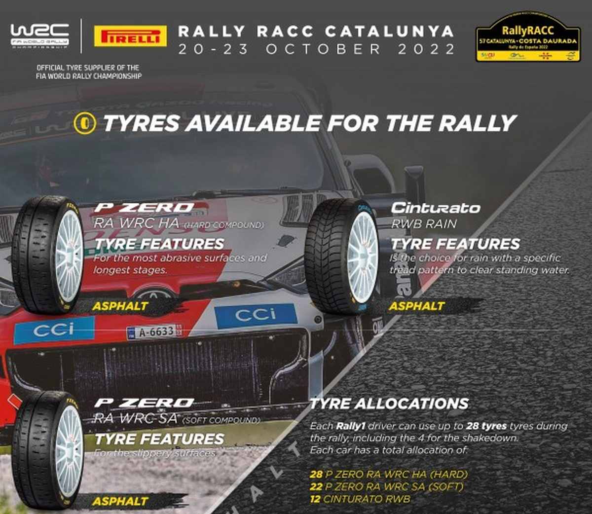 Pirelli porta in Catalogna 880 gomme per le vetture Rally1. Le allocazioni per la categoria top sono: 28 pneumatici per i P Zero RA WRC HA, 22 per i P Zero RA WRC SA, 12 per i Cinturato RWB.