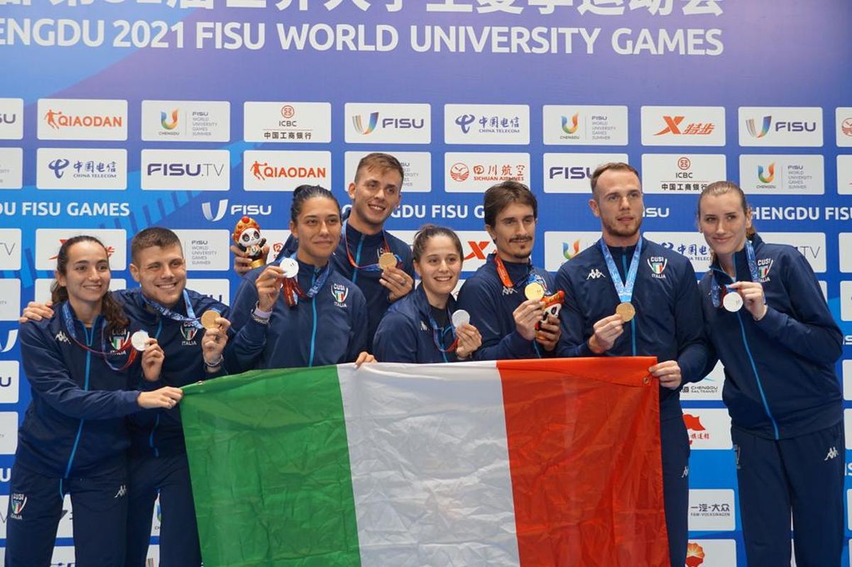 CHENGDU (CINA) (ITALPRESS) – Grande Italia a Chengdu nella quarta giornata delle Universiadi con le prime due prove a squadre che regalano gioie alla spedizione. Medaglia d’oro per la formazione di sciabola maschile composta da Alberto Arpino, Dario Cavaliere, Giacomo Mignuzzi e Leonardo Dreossi, argento per la spada femminile con Alessandra Bozza, Sara Maria Kowalczyk, Roberta Marzani e Gaia Traditi. Il bottino azzurro sale così a 5 medaglie con due ori e tre argenti. Stupenda vittoria per la squadra degli sciabolatori. Gli azzurri, con il maestro Fabio Di Lauro dello staff del CT Nicola Zanotti a seguirli da fondo pedana, hanno iniziato la loro prova con il successo sull’Azerbaijan per 45-31. Ancora una vittoria ampia per l’Italia nei quarti di finale contro la Polonia con il punteggio di 45-30. Alberto Arpino, Dario Cavaliere, Leonardo Dreossi e Giacomo Mignuzzi hanno poi battuto in semifinale il Kazakhistan 45-26 regalandosi la possibilità di giocarsi l’oro. Nel match decisivo, gli azzurri hanno trovato sulla loro strada la Corea del Sud che aveva conquistato il titolo a Napoli nel 2019. Frazione dopo frazione l’Italia ha creato un solco che ha permesso alla nostra squadra di essere in vantaggio fin dalla sesta frazione per chiudere con il 45-38 e salire sul gradino più alto del podio.