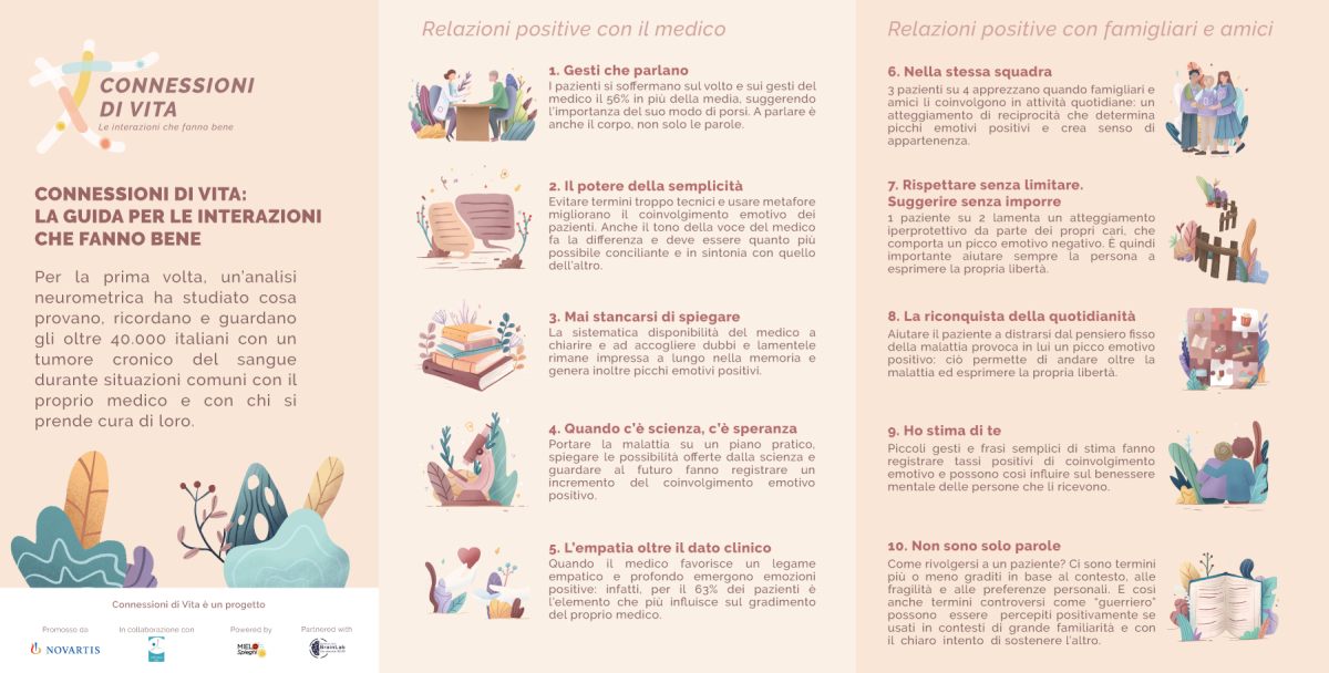 MILANO (ITALPRESS) – Cosa guarda, cosa ricorda e cosa prova chi convive con un tumore cronico del sangue? Gli occhi si soffermano sul volto e sui gesti del medico il 56% più della media, mentre resta impressa a lungo nella memoria la disponibilità dell’ematologo a chiarire anche i concetti più difficili. A generare invece intensi picchi emotivi, rilevati dal battito cardiaco e dalla sudorazione cutanea, è la capacità dei famigliari di distrarre il paziente dal pensiero fisso della malattia. A metterlo in luce è la prima analisi neurometrica sulle interazioni che i pazienti con Neoplasie Mieloproliferative Croniche e Leucemia Mieloide Cronica vivono con i loro medici, famigliari e amici. Proprio dai risultati dello studio – condotto dal centro di ricerca Behavior and Brain Lab dell’Università IULM di Milano – nasce “Connessioni di Vita. La guida per le interazioni che fanno bene”, promossa da Novartis, in collaborazione con AIPAMM, nell’ambito della campagna di informazione e sensibilizzazione MIELO-Spieghi. Un vademecum di utilità sociale per costruire relazioni positive e di qualità: infatti i piccoli gesti, le parole e le interazioni che gli oltre 40.000 pazienti italiani stabiliscono con i medici e con i loro cari hanno un impatto diretto sul loro benessere mentale e sono così in grado di fare la differenza nel percorso di malattia di un tumore del sangue dall’andamento cronico.
