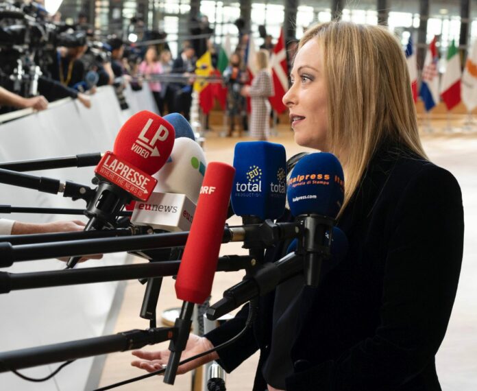 Belgium, Brussels -March 23, 2023 European Council Italy’ s premier Giorgia Meloni (Brussels - 2023-03-23, EUC/ROPI) p.s. la foto e' utilizzabile nel rispetto del contesto in cui e' stata scattata, e senza intento diffamatorio del decoro delle persone rappresentate