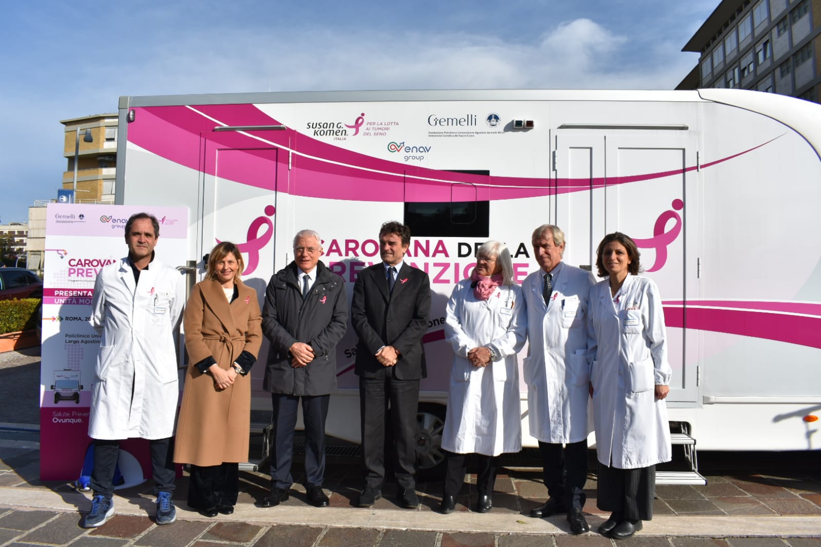 “La Carovana della Prevenzione è una iniziativa consolidata e di successo di alto valore sociale che il Gemelli sostiene con entusiasmo accanto a Komen Italia – dichiara il Direttore Generale della Fondazione Policlinico Universitario Agostino Gemelli IRCCS, professor Marco Elefanti. Un sentito ringraziamento per il sostegno alla Carovana va ad Enav anche da parte del Gemelli – continua il Direttore Generale. Grazie alla donazione di questa nuova Unità Mobile di prevenzione senologica su cui opera personale sanitario specializzato della nostra Fondazione viene rafforzata la ‘flottà dei mezzi a disposizione per la promozione della salute delle donne. Sarà così possibile offrire a un pubblico sempre più ampio attività gratuite di prevenzione a tutela della salute in particolare di quella popolazione femminile fragile che ha maggiore difficoltà di accesso alle strutture sanitarie”.