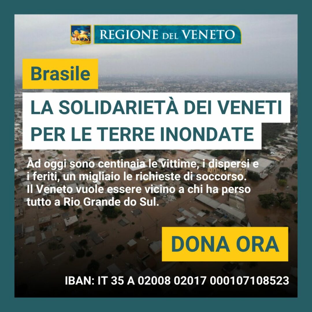 VENEZIA (ITALPRESS) – “La catastrofe naturale che ha colpito Rio Grande do Sul ha toccato profondamente i nostri cuori: ad oggi i decessi sono quasi un centinaio, altrettanti i dispersi e i feriti, un migliaio le richieste di soccorso e gli sfollati hanno superato le centinaia di migliaia. La situazione è veramente drammatica e le immagini che tutti noi abbiamo visto raccontano di una terra colpita tragicamente. Per esprimere la vicinanza e dare un sostegno concreto alla comunità sudamericana, abbiamo aperto un conto corrente di solidarietà i cui proventi verranno destinati a coloro che hanno perso tutto e sono stati colpiti dalla devastazione di questi giorni”. Così il Presidente della Regione del Veneto Luca Zaia annuncia l’attivazione di un conto corrente dedicato per raccogliere fondi da destinare ai residenti nello Stato di Rio Grande do Sul (Brasile) attraverso le istituzioni e le associazioni locali, denominato “REGIONE DEL VENETO SOSTEGNO EMERGENZA ALLUVIONE RIO GRANDE DO SUL con IBAN: IT 35 A 02008 02017 000107108523”.